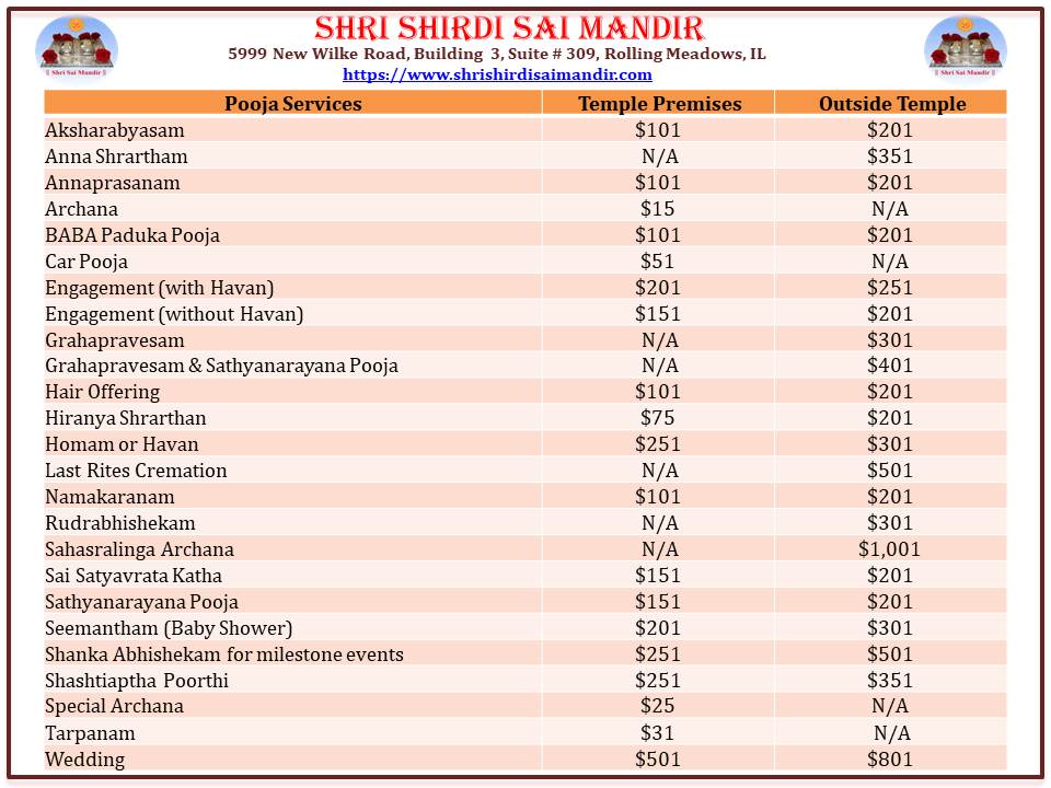 Pooja Services and donation amounts If you have any other queries or clarifications, kindly mail to This email address is being protected from spambots. You need JavaScript enabled to view it. or call us at 630-21-MYSAI or 630-216-9724.